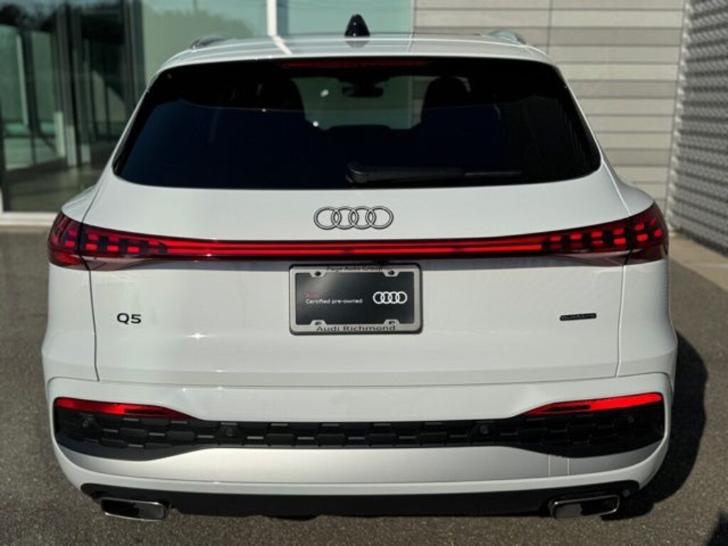 CARFAX One-Owner. Clean CARFAX. Certified. Glacier White Metallic 2025 Audi All-new Q5 2.0T Premium Plus quattro quattro 7-Speed Automatic S tronic 2.0L 4-Cylinder TFSI 20" Wheel Package with Y-Spoke Design, Adaptive Cruise Assist, AM/FM radio: SiriusXM w/360L, Animation For Headlights and Taillights, Audi Beam-Rings, Automatic temperature control, Bang & Olufsen Sound System with 3D Sound, Black Warm Weather Package, Dynamic Interaction Light, Exterior Parking Camera Rear, Front dual zone A/C, Garage door transmitter: HomeLink, Head-Up Display, Headlight Washers, Heated Steering Wheel with Hands-on Detection, LED Headlights Plus with Digital DRL, LED Interior Lighting Pro Package, Manual Rear Side Window Sunshades, Navigation system: Audi Navigation Plus, Panoramic Sunroof, Power Liftgate, Premium Plus, Radio: MMI Navigation Plus, Rear air conditioning, Top View Camera System, USB Power Delivery (2x60W Front and 2x100W Rear), Ventilated Front Sport Seats, Wheels: 20" 5-Double-Y-Spoke Design.