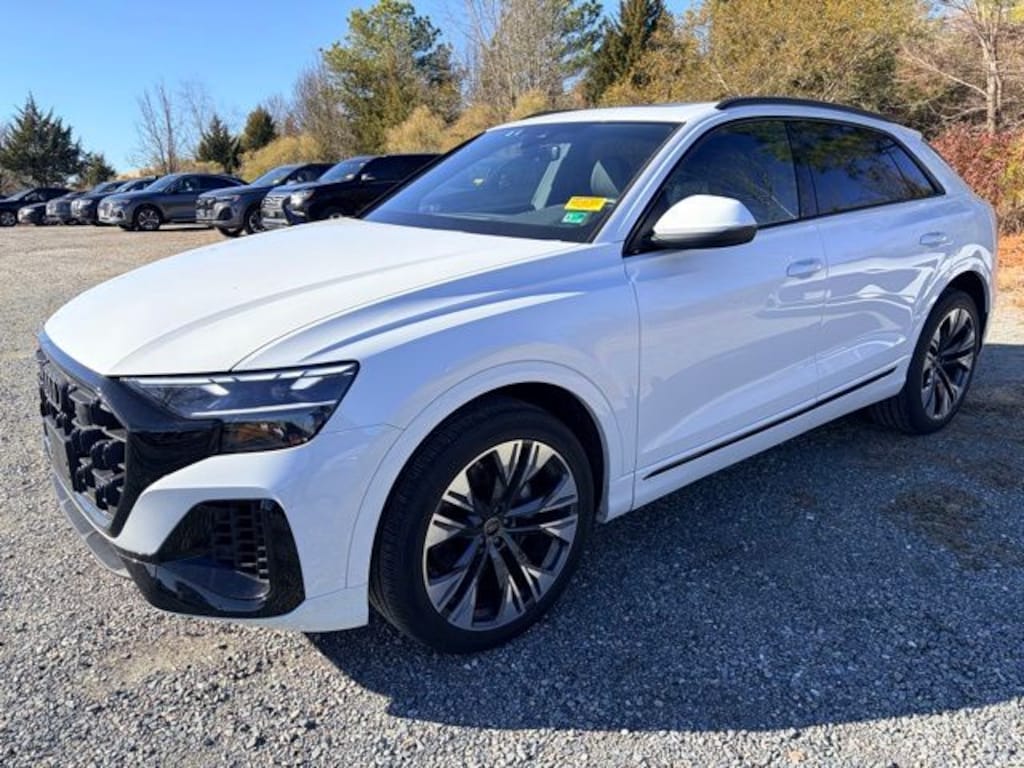 CARFAX One-Owner. Clean CARFAX. Certified. Glacier White Metallic 2025 Audi Q8 55 Premium quattro quattro 8-Speed Automatic with Tiptronic 3.0L V6 Turbocharged DOHC 24V LEV3-ULEV70 335hp 10 Speakers, Adaptive suspension, AM/FM radio: SiriusXM w/360L, Anthracite Gray Audi Rings, Audi Guard Protection Kit, Automatic temperature control, Black Exterior Trim, Black Optic Package, Dark Chrome Exhaust Tips, Exterior Parking Camera Rear, Front and Rear Doors Audi Beam-Rings, Front dual zone A/C, Garage door transmitter: HomeLink, Heated Front Bucket Seats, Navigation system: Audi MMI Navigation with Touch Response, Power Liftgate, Power moonroof: Panoramic, Radio: Audi MMI Navigation Plus with MMI Touch Response, Rear air conditioning, Wheels: 22" 5-Double-Arm Design Bicolor Finish.
